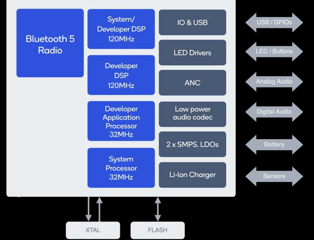 Qualcomm QCC5124 system-on-chip (SoC) er designet for å møte behovene til små enheter for en robust, høykvalitets, trådløs Bluetooth-lytteopplevelse med lavt strømforbruk for lengre lydavspilling. QCC5124-arkitekturen er designet for høy ytelse med lavt strømforbruk. Sammenlignet med den tidligere teknologien kan strømforbruket reduseres med opptil 65 prosent, noe som muliggjør lengre lydavspilling i nesten alle driftsmoduser.