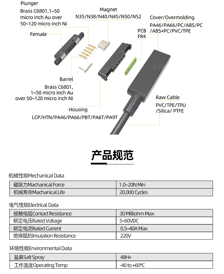 Den magnetiske kontakten er en kombinasjon av magneter på basis av pogo pin-kontakten, og bruken av RuFeB permanente magneter sikrer en stabil og pålitelig forbindelse mellom hann og hunn. Den magnetiske pogopin-kontakten oppveier fordelene med praktisk innsetting, sikkerhet, kompakt størrelse, enkel rengjøring og sideavtrekk som tradisjonelle koblinger mangler, og virkelig realiserer 100 prosent automatisk posisjonering, automatisk tilkobling, rask innsetting, separasjon med en ekstern kraft, tvunget frakobling vil ikke skade tilkoblingsporten og andre funksjoner på enheten; det har blitt raskt popularisert og brukt på mange felt.